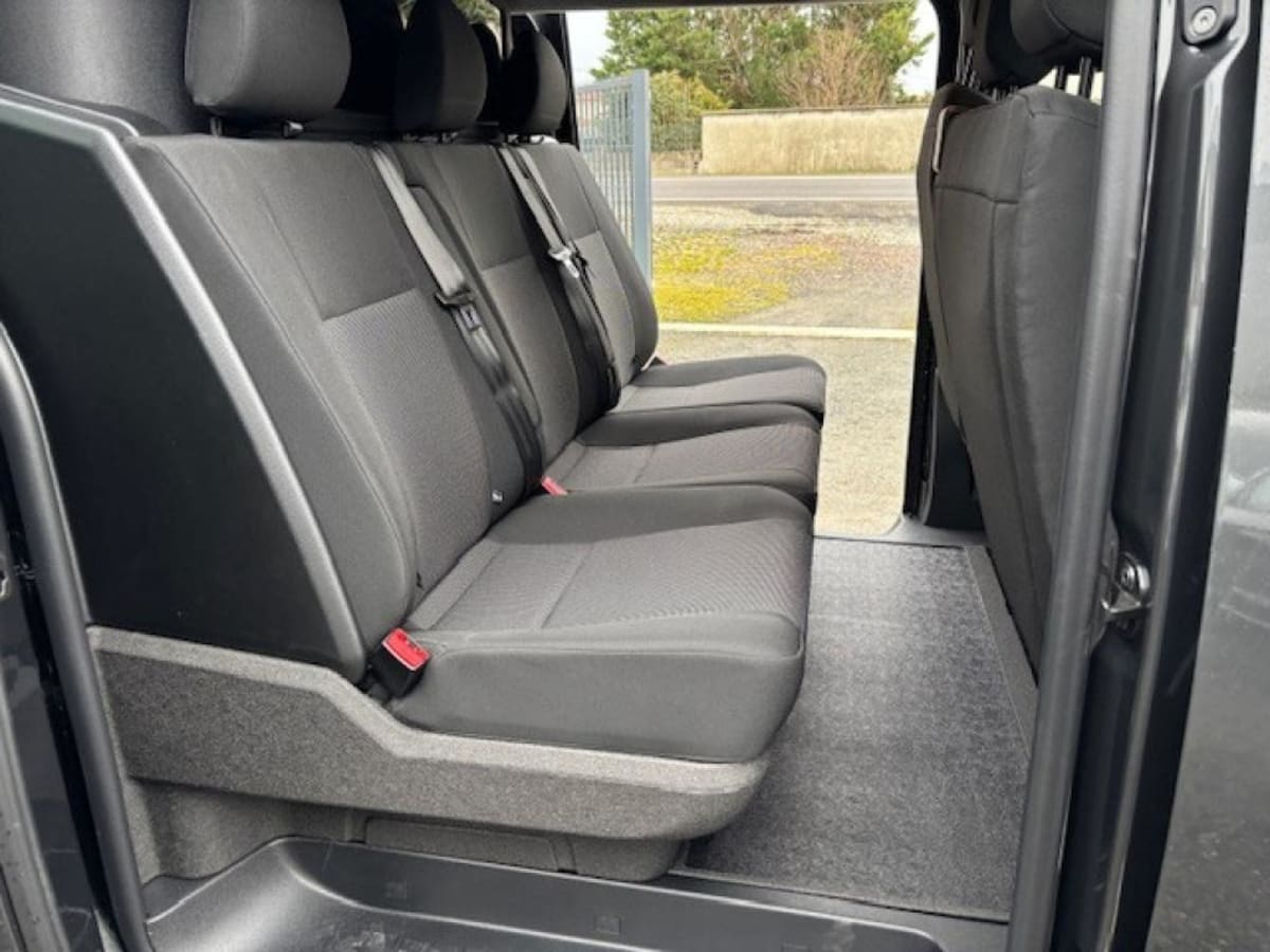 banquette fixe 3 places en rang 2 avec appui-tête réglables et 2 accoudoirs, position unique conforme aux réglementations fiscales pays, avec coffre de rangement amovible sous assises gauche et centrale (accessible depuis habitacle) et avec zone pour c