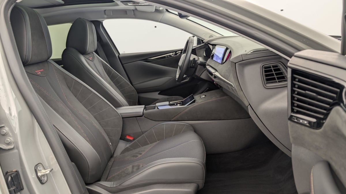 intérieur tissu tressé basalte avec alcantara : planche de bord en alcantara panneaux de portes en alcantara console centrale en alcantara sellerie en tissu tressé basalte avec alcantara et toile ds décors de panneaux de porte chrome guilloché volant en cuir fleur mistral avec surpiqûres ciel de pavillon salin