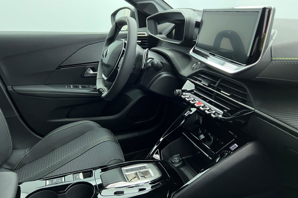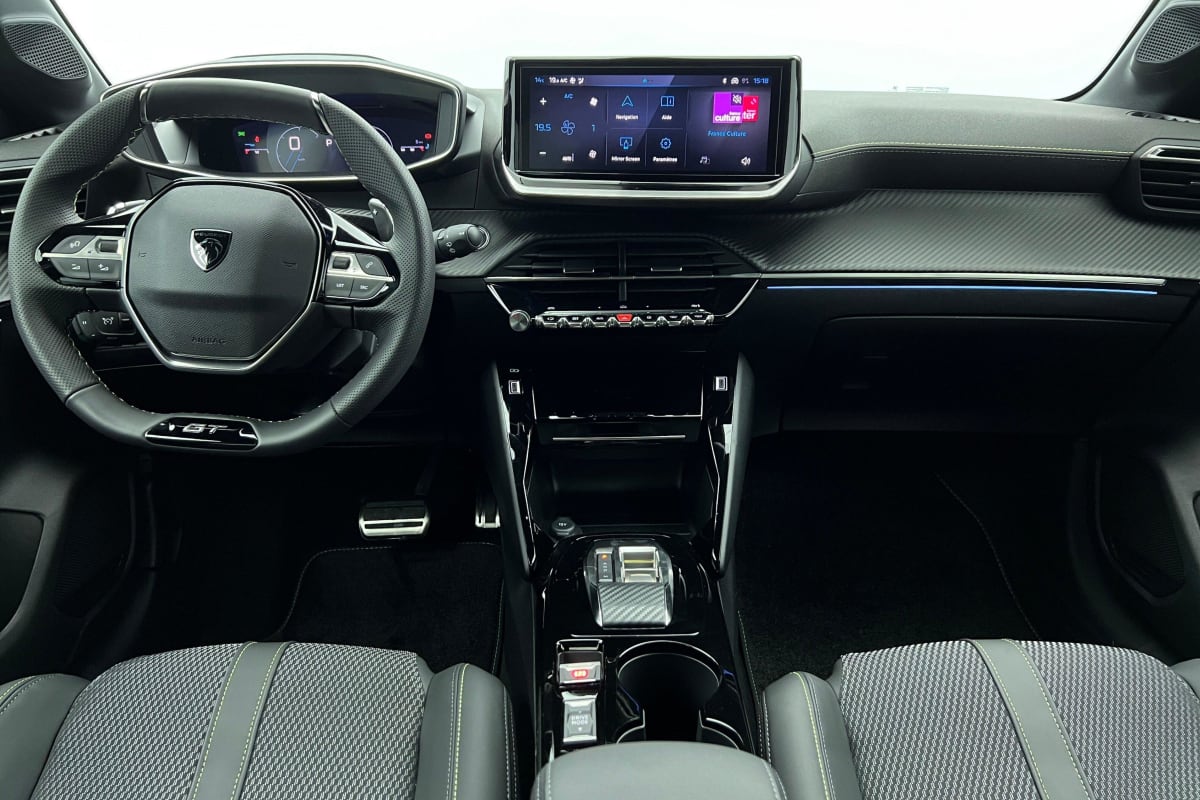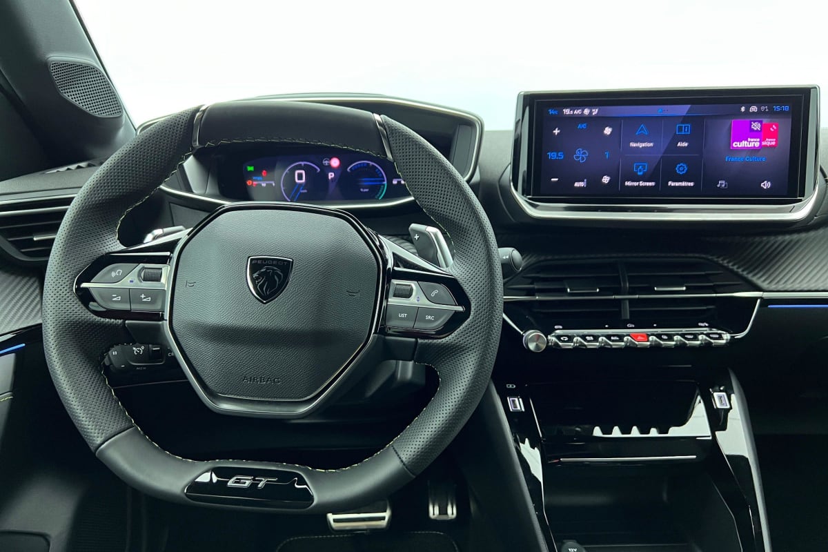 Volant compact cuir fleur avec commandes multimédia intégrées et badge GT