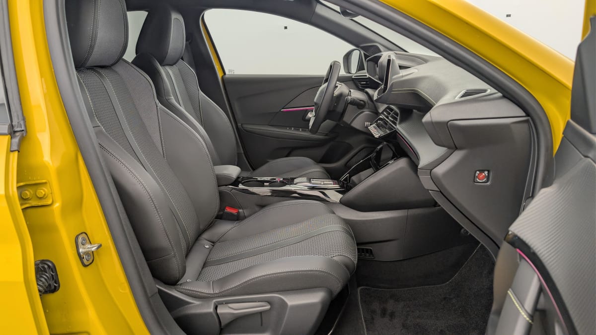 volant compact cuir fleur avec laçage vert, lion chromé et badge gt et commandes multimédia sur volant