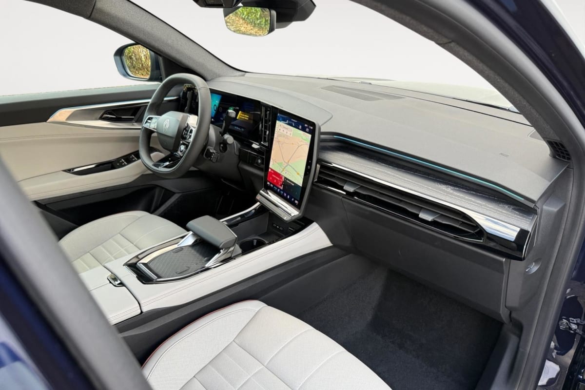 accoudoir central et inserts de portes en textile enduit grainé avec surpiqûres argent
