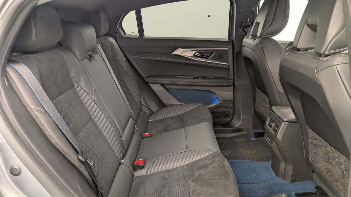 sellerie mixte alcantara avec surpiqûres bleues et logo alpine lumineux