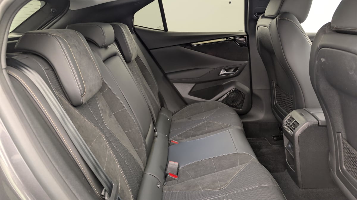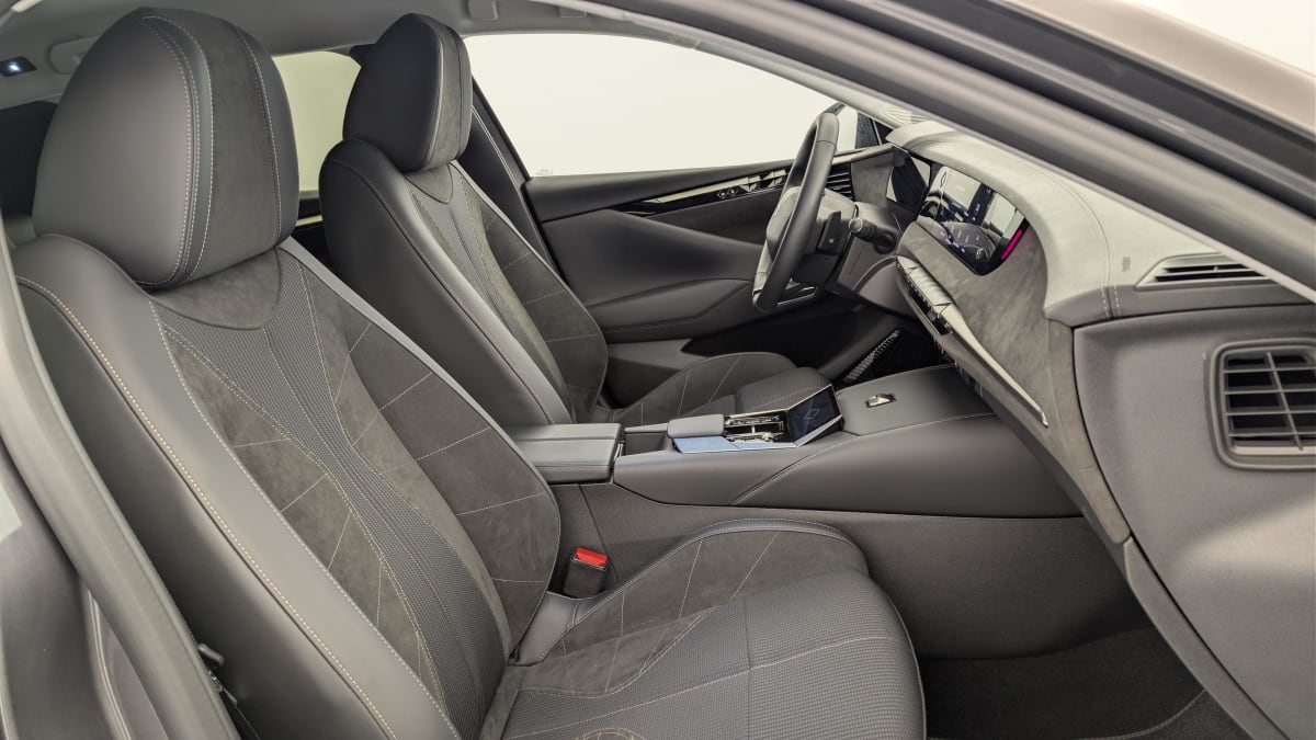 intérieur alcantara noir : planche de bord en alcantara ciel de pavillon clair sellerie en tissu tressé basalte avec alcantara et toile ds décors de panneaux de porte chrome guilloché volant cuir fleur mistral console en toile ds noir basalte panneaux de porte en alcantara et toile ds noir basalte