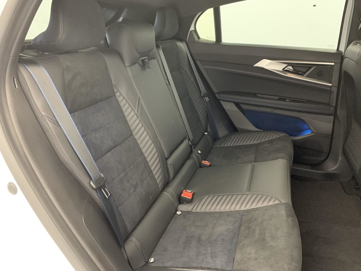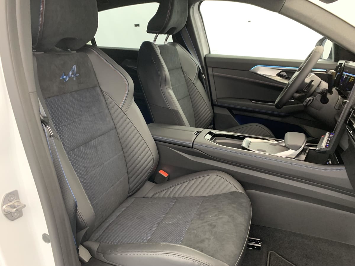 Sellerie mixte Alcantara avec surpiqûres bleues et logo Alpine lumineux