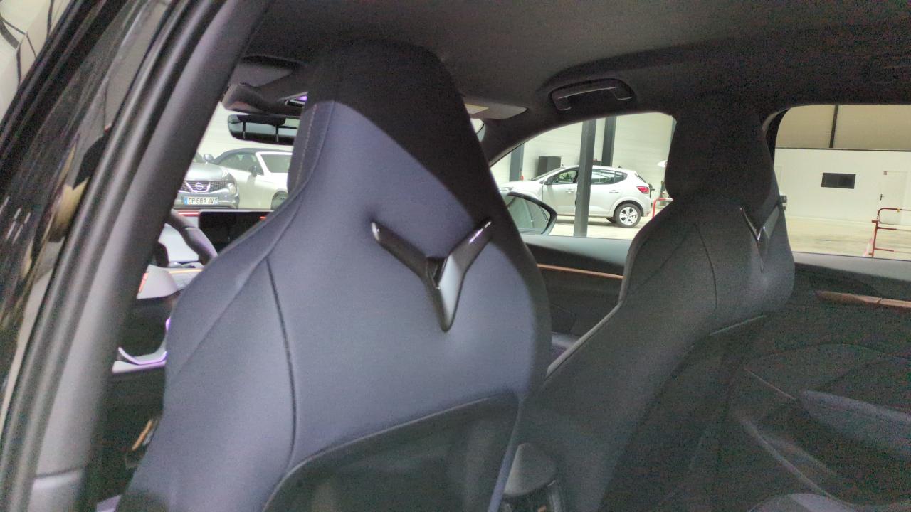 design intérieur deep ocean (sièges baquets tep + textile bleu acier) - logos cupra estampés sur les appuie-têtes - planche de bord bleu acier texturée avec aérateurs cuivrés - contre-portes en tep noir texturé - ciel de pavillon noir - sièges conducteur et passager avec réglage manuel en hauteur et lombaire